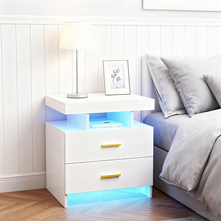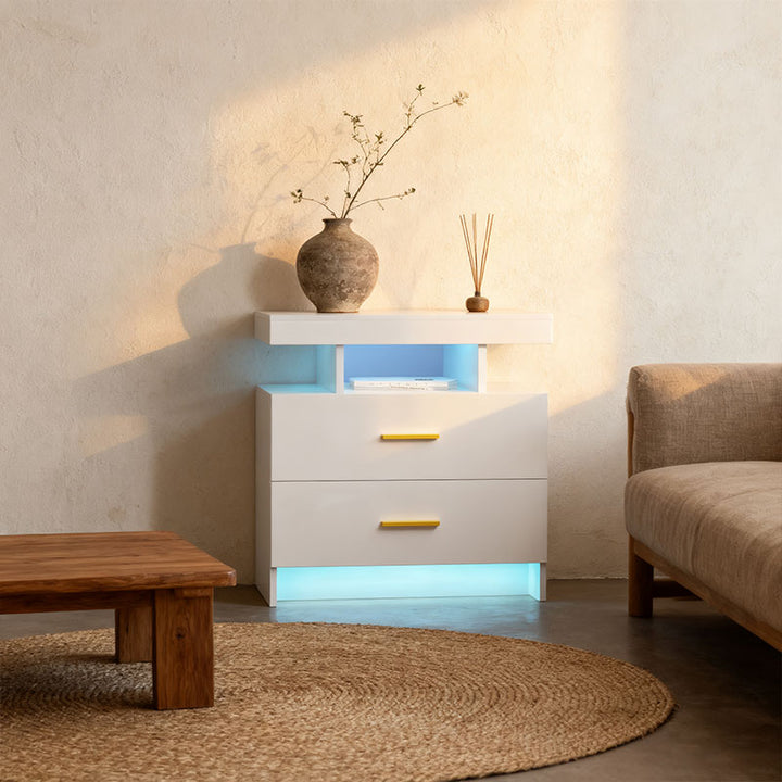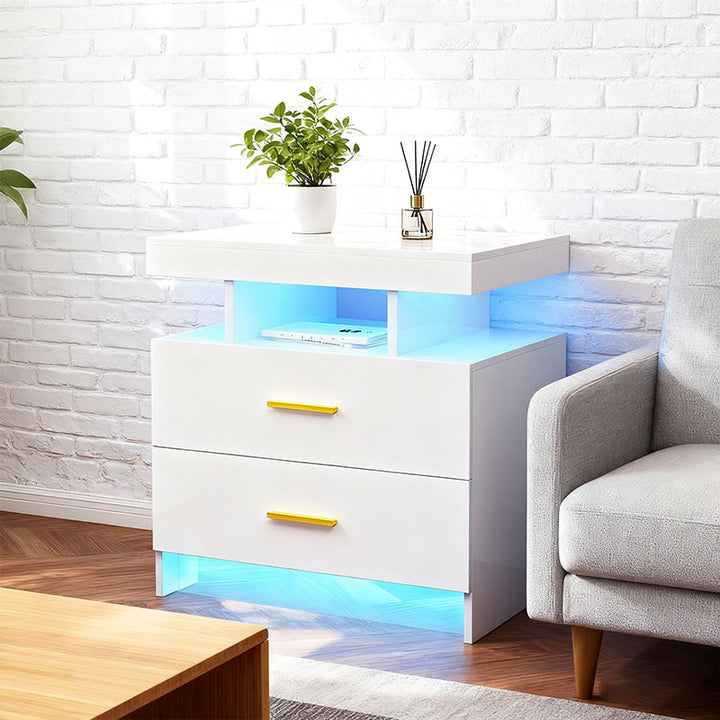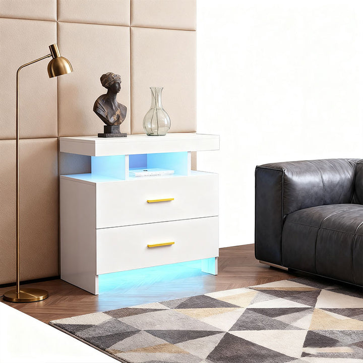 [Double LED Strips] Enhance the ambiance of your space with the dual LED strips built into this nightstand. With 25 colors, 6 brightness levels, 3 flashing modes, and 6 blinking rates, you can change colors and modes to create the perfect atmosphere