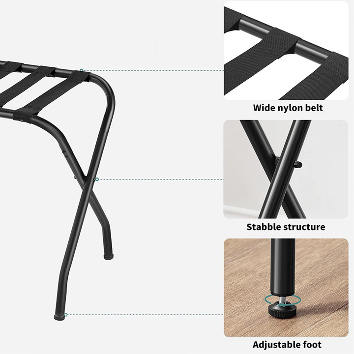 [Secure, Strong, and Stable] Fastened to the steel frame, the nylon straps will always stay in place without moving during use; each suitcase stand is strong to hold up to 110 lb; the adjustable feet improve the stability and won’t scratch the floor