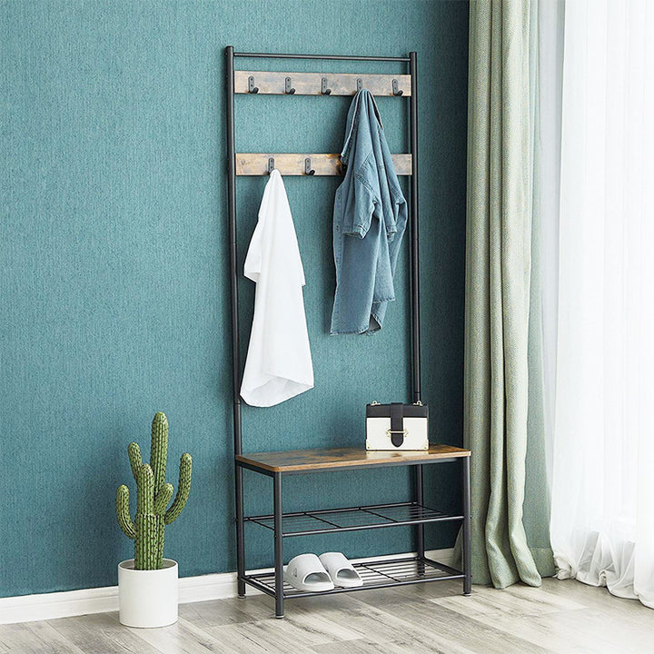 [Shoe Bench with Shelves] This entryway bench with a coat rack is supported by a sturdy steel frame, providing stable support for the items placed on it.