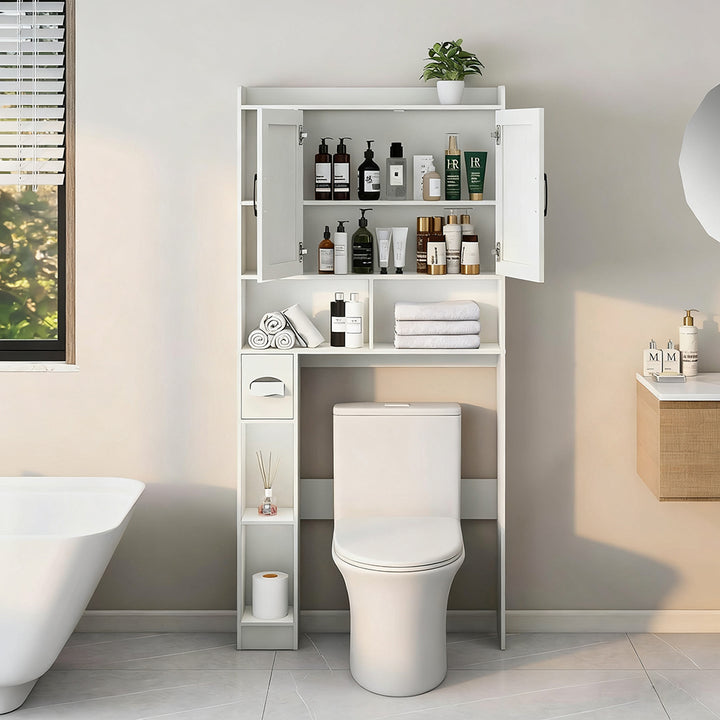 【SPACIOUS YET SPACE-SAVING】Featuring shelves for toiletries, a small bottom cabinet, and a toilet paper roll holder in the compartment, this bathroom shelf keeps everything within easy reach. It occupies minimal floor space, optimizing your bathroom space