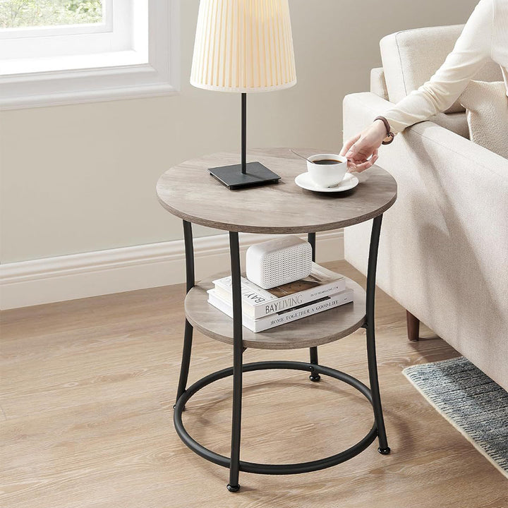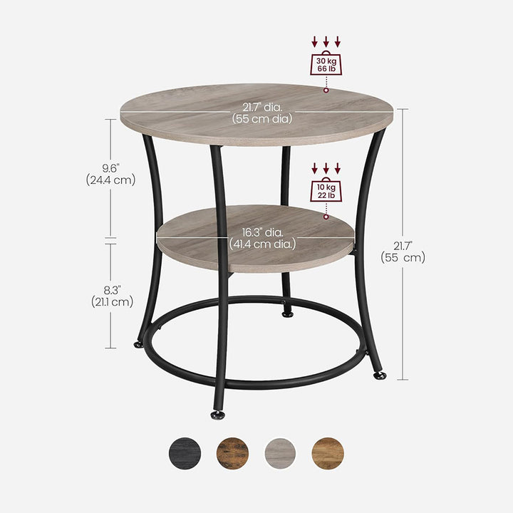 [Robust Little Fellow] The 21.7″ dia. side table has stable steel legs, which are additionally reinforced by round tubes. The table does not yield whether you place a 66 lb bronze statue on the top shelf, nor when you use it for many years