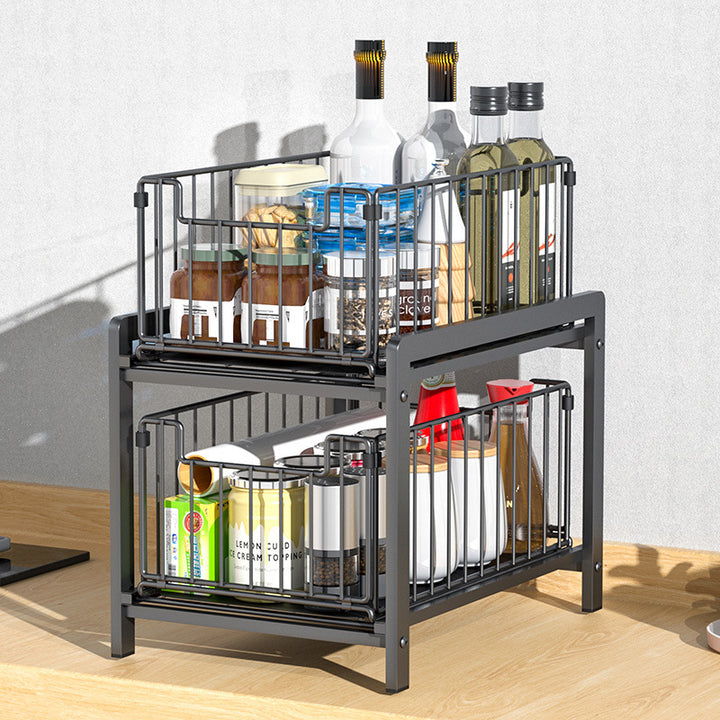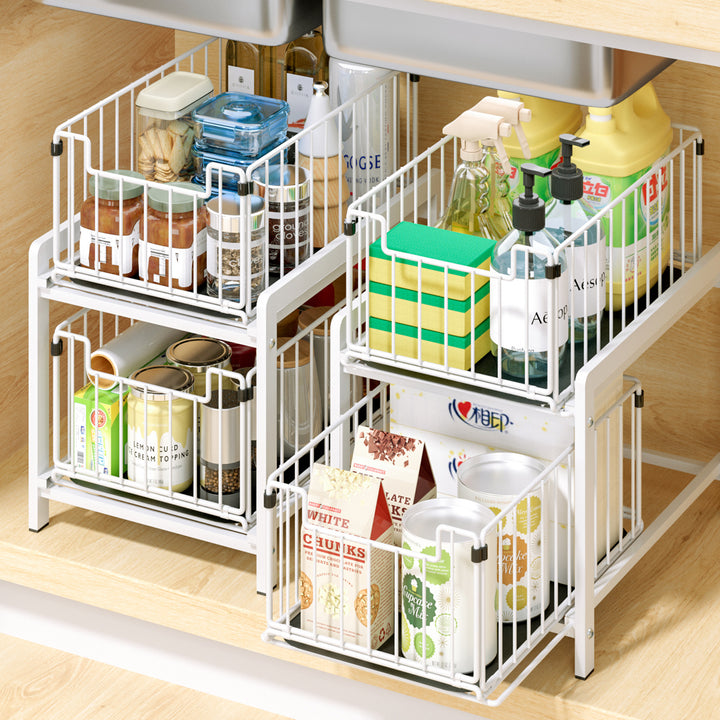 [What You Get] Two 2-tier cabinet organizers crafted of sturdy steel, with non-slip plastic foot pads to protect your countertop from potential scratches and add extra stability, and pull-out basket drawers to store your items for a quick grab and go