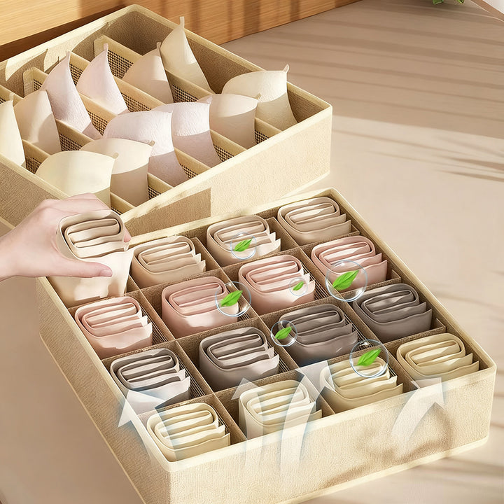 【DURABLE USE】The underwear organizer, made from non-woven fabric and reinforced with PP panels, resists deformation and provides durability. Its nylon mesh-divided compartments stay crease-free and ventilated
