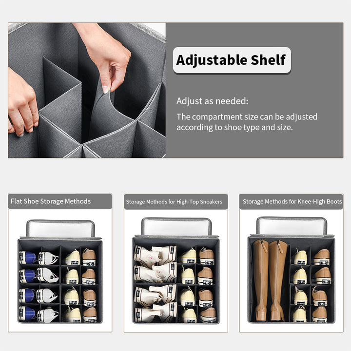 Customisable: Flexible dividers allow compartments to adjust according to shoe size. The storage box can hold shoes, clothes, and bags of different sizes