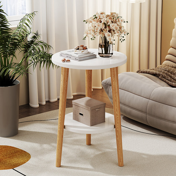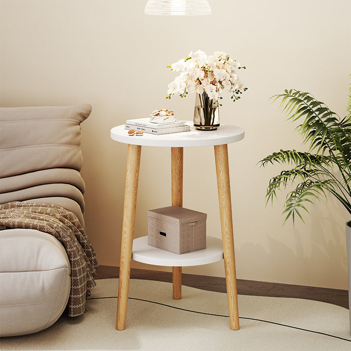 [Modern Vibe] The round tabletop, natural beige finish, and angled legs merge on this small side table, adding a clean, sleek modern vibe to your living space