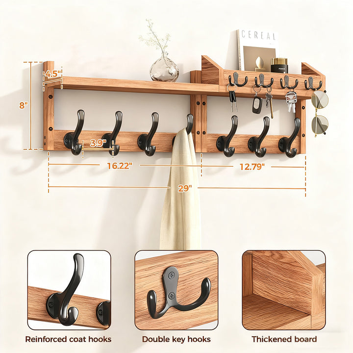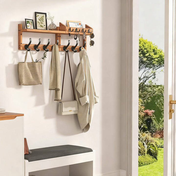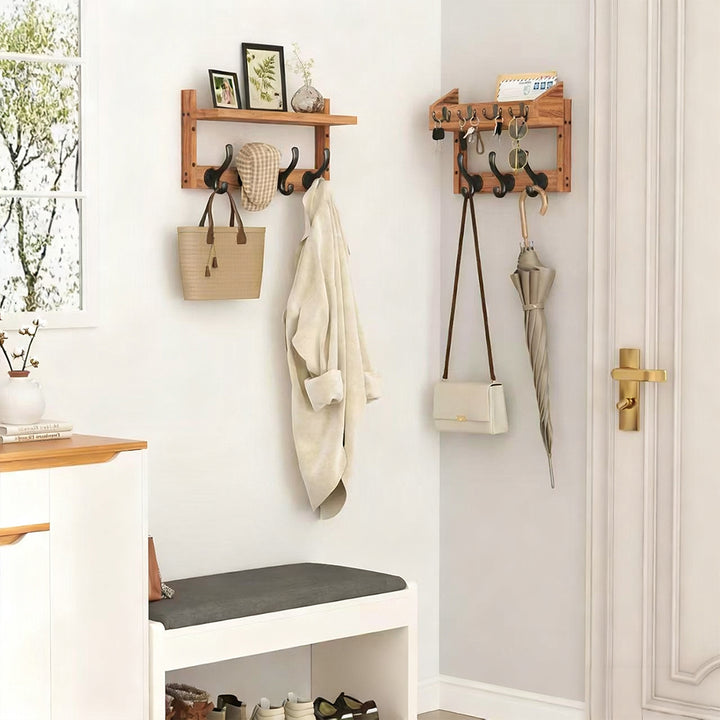 [2-in-1 Design] Coat rack and shelf in one—4 dual hooks for coats, bags, scarves, and hats, plus a top shelf for wallets and keys. Also, the groove on the shelf is perfect for photo frames and decorative pictures